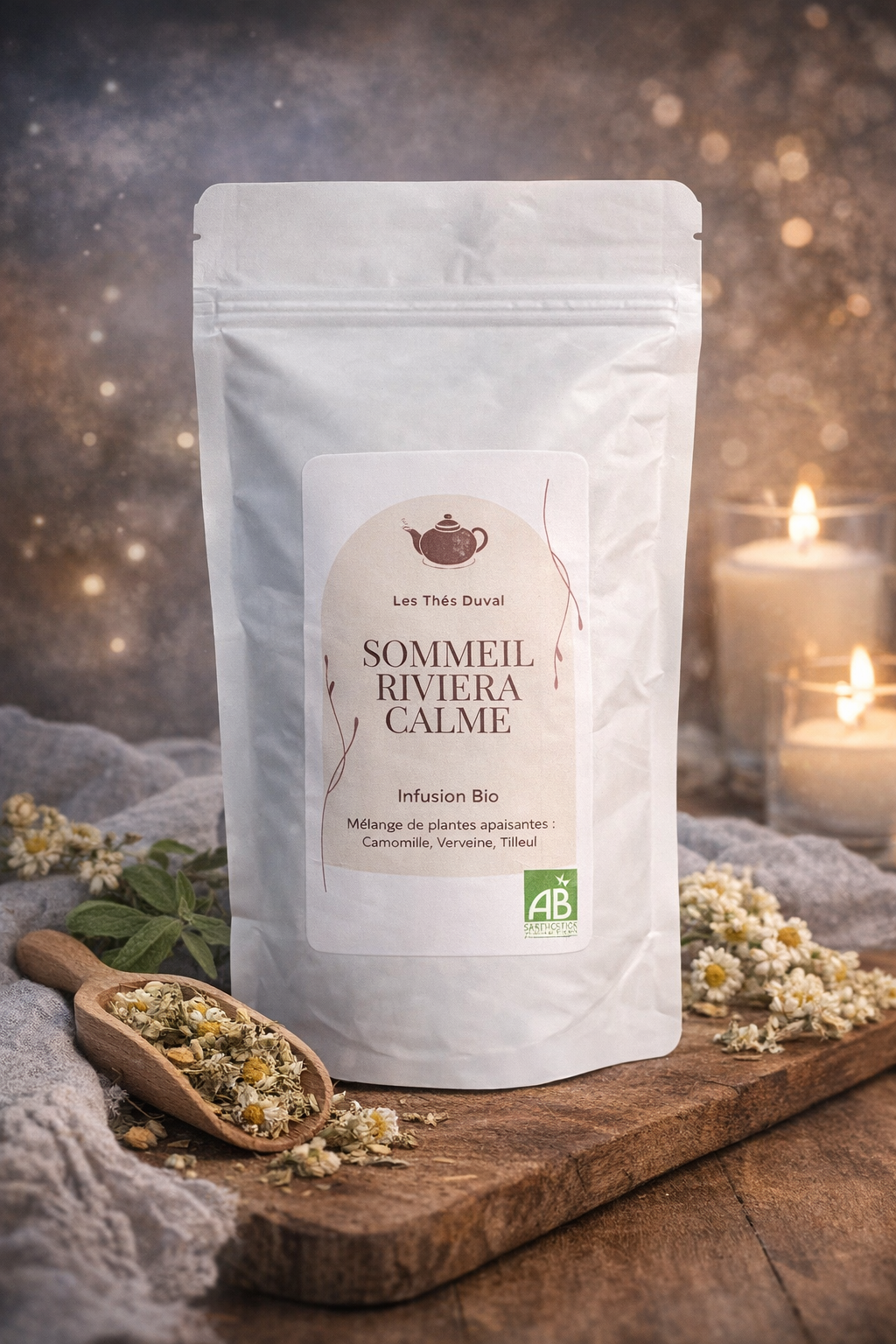 Laissez-vous envelopper par Riviera Calme, une infusion bio aux plantes apaisantes, pensée pour vous accompagner vers des nuits sereines.
