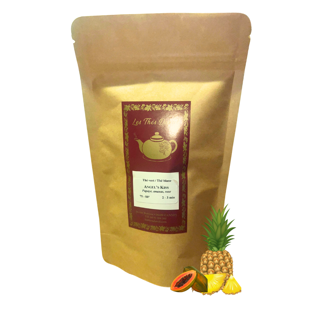 Laissez-vous envoûter par Angel’s Kiss en mousselines Duval, un mélange raffiné de thé vert et thé blanc, sublimé par des notes exotiques d’ananas et de papaye, et la délicatesse de la rose. Une infusion douce et fruitée qui éveille les sens.