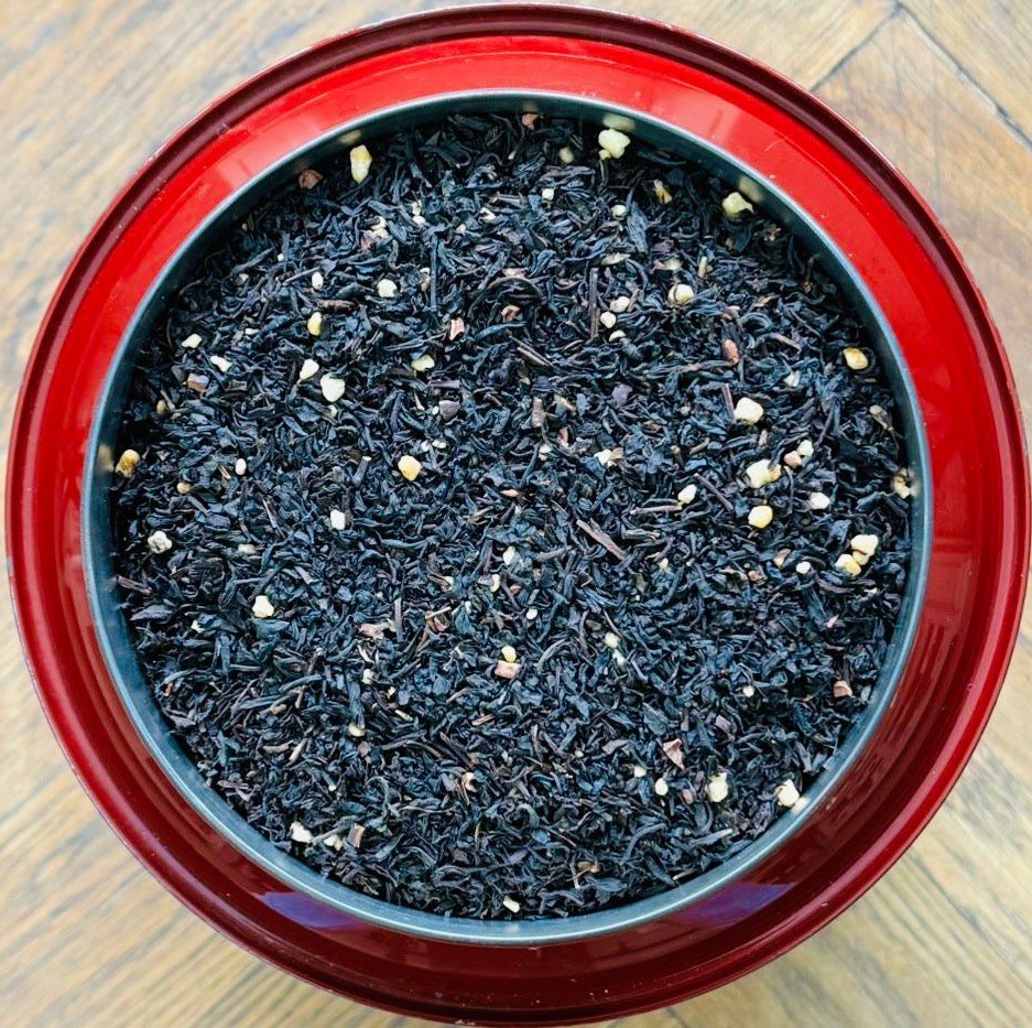 - Feuilles : Blend exclusif de thés noirs Chine Keemun et Ceylan FBOP (81 %), feuilles brisées et dorées, pour une liqueur cuivrée profonde qui porte toute la rondeur du dessert.